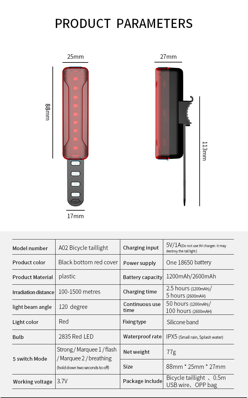 The Natfire350 A02 Rear Bike Light is a reliable, powerful lighting solution for cyclists. With 100 lumens and a battery capacity of 1200mAh, it offers 40 hours of illumination on the flashing setting. Constructed with waterproof IPX5 casing and a secure seat post mounting, this rear bike light offers reliable visibility and convenience.